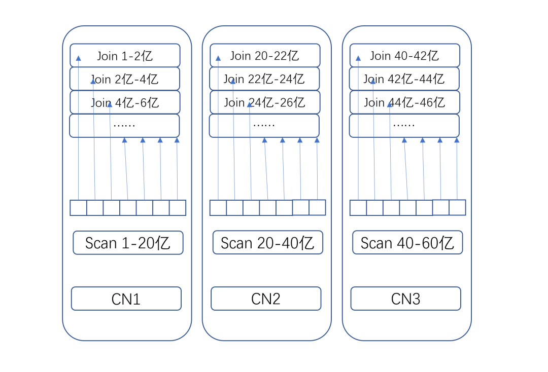 colocate shuffle join的具体原理是,从scan开始,利用block zonemap将数据分布到对应的CN上,并且尽可能保证后续的shuffle算法会将数据shuffle到当前CN上进行处理,最大程度减少数据跨网络发送。在这个例子中,优化器会告诉scan算子,block zonemap处于1-20亿之间的数据在CN1上读取,20亿-40亿之间的数据在CN2上读取,40亿到60亿之间的数据在CN3上读取。同时优化器会告诉shuffle join,1-20亿之间的数据需要shuffle到CN1上进行计算,20亿-40亿之间的数据shuffle到CN2上计算,40亿到60亿之间的数据在CN3上计算。如果每个CN有10核,那么具体到CN1是1-2亿之间在第一个pipeline上处理,2亿-4亿在第二个pipeline上处理,以此类推。具体到CN2是20亿-22亿之间在第一个pipeline上处理,22亿-24亿在第二个pipeline上处理,以此类推。具体到CN3是40亿-42亿之间在第一个pipeline上处理,42亿-44亿在第二个pipeline上处理,以此类推。