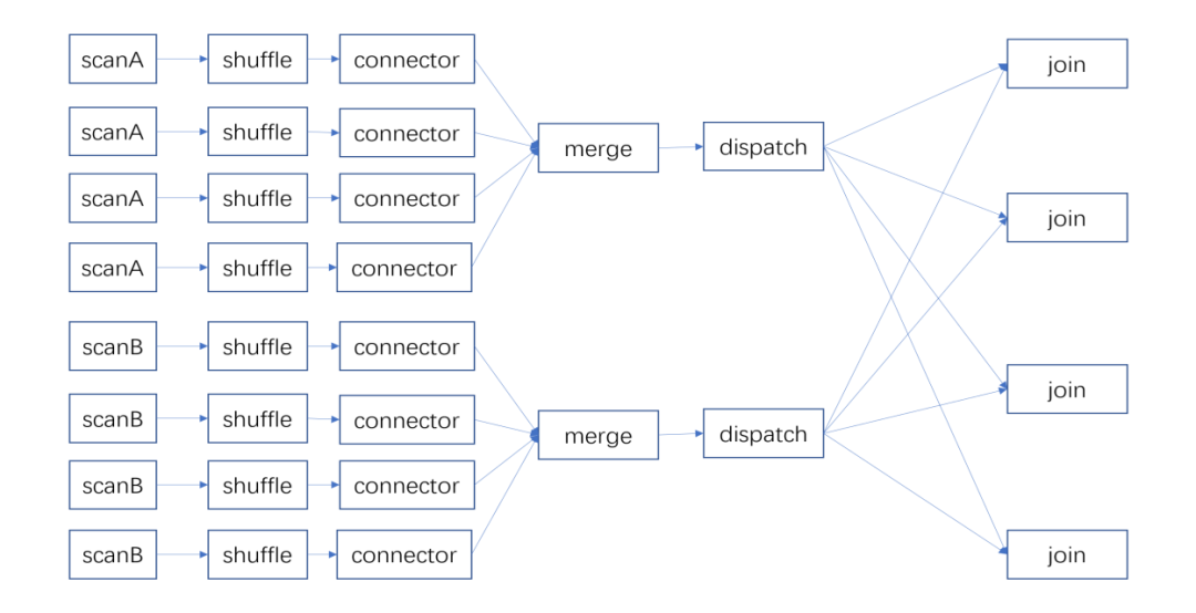 对join算子的shuffle,同样是将join算子在编译pipeline时静态展开成多个pipeline。join的输入分为probe和build两边,对两边的输入数据采用同样的shuffle算法,保证相同数据会分到同一个桶内。每个join算子也可以直接将join结果输出,而不需要做merge。